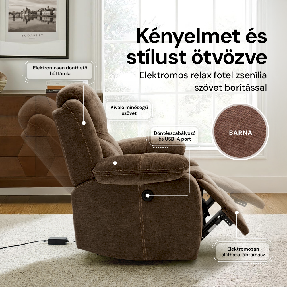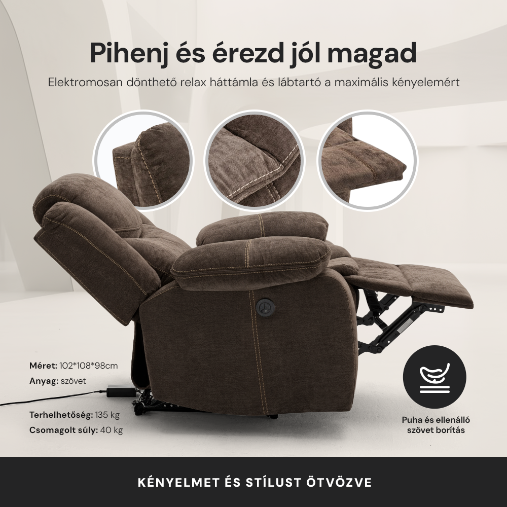 Ez az elektromos relax fotel nemcsak a kényelmet, hanem a modern megjelenést is biztosítja. Ideális választás mindazoknak, akik a pihenést elegánsan, maximális komfortban szeretnék élvezni.