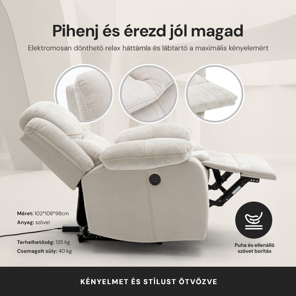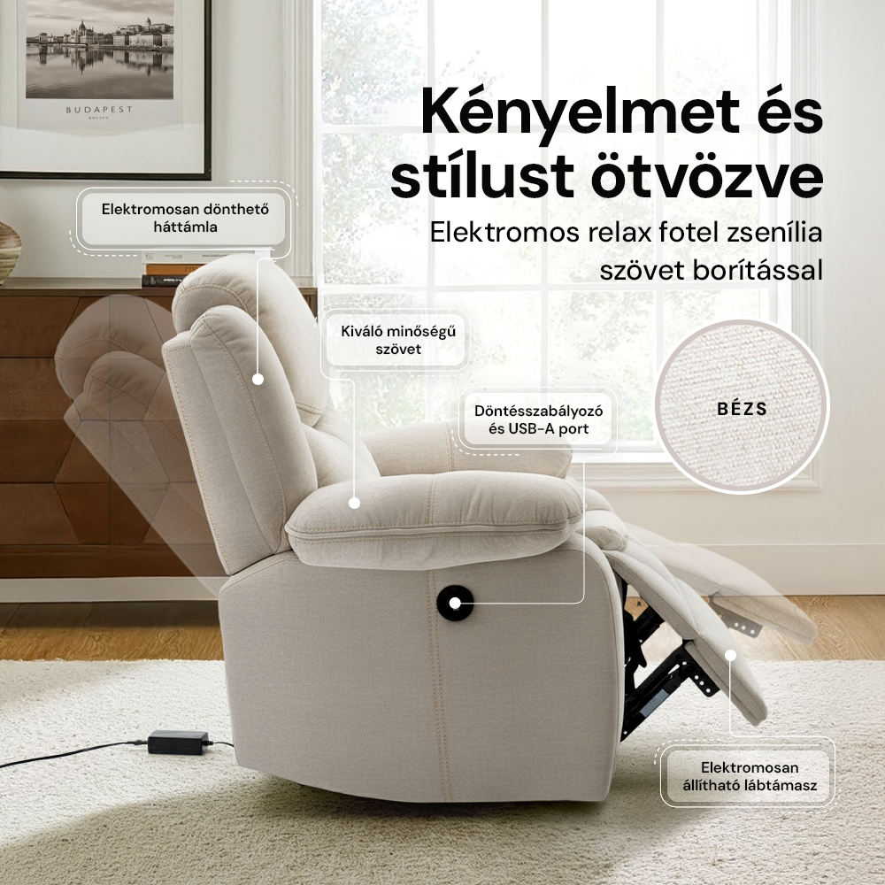 Ez az elektromos relax fotel nemcsak a kényelmet, hanem a modern megjelenést is biztosítja. Ideális választás mindazoknak, akik a pihenést elegánsan, maximális komfortban szeretnék élvezni.