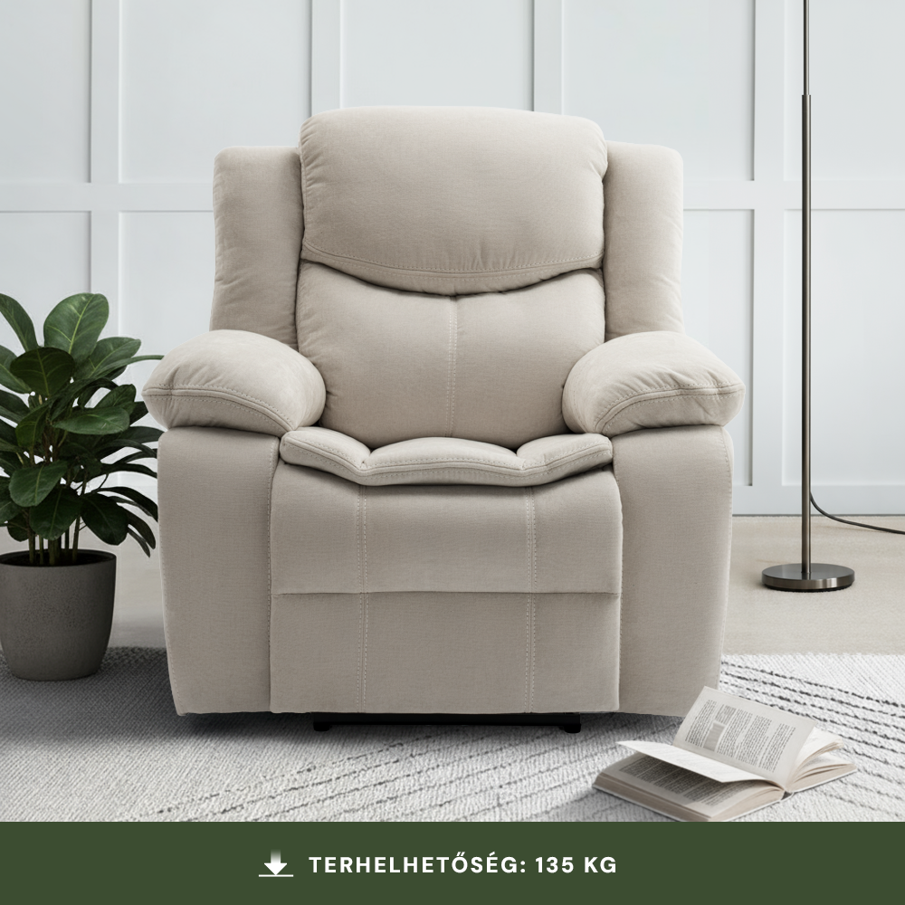 A masszív felépítésű relax fotel akár 135 kg terhelhetőséggel is rendelkezik, így hosszú távon megbízható társ lesz a pihenésben. A stabil mechanika és a minőségi anyaghasználat garantálja a biztonságos és tartós működést.