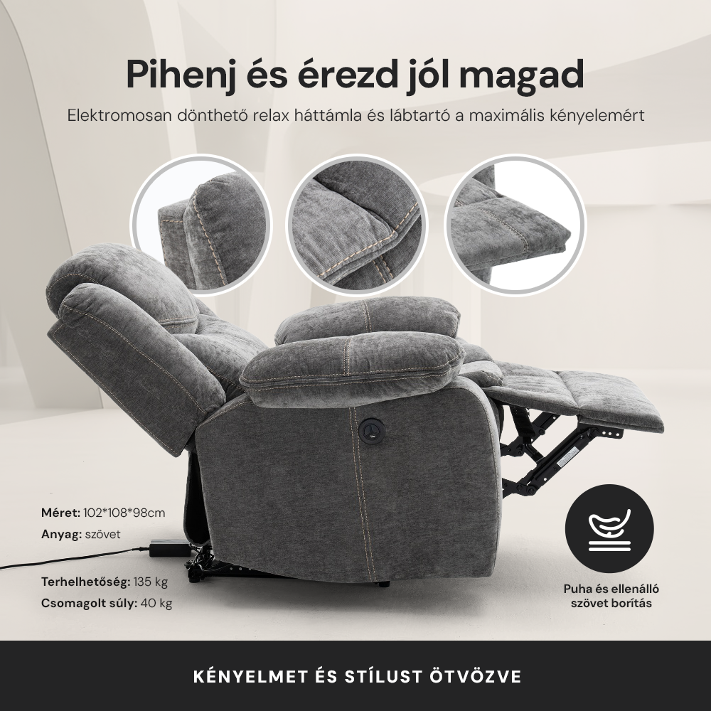 Ez az elektromos relax fotel nemcsak a kényelmet, hanem a modern megjelenést is biztosítja. Ideális választás mindazoknak, akik a pihenést elegánsan, maximális komfortban szeretnék élvezni.