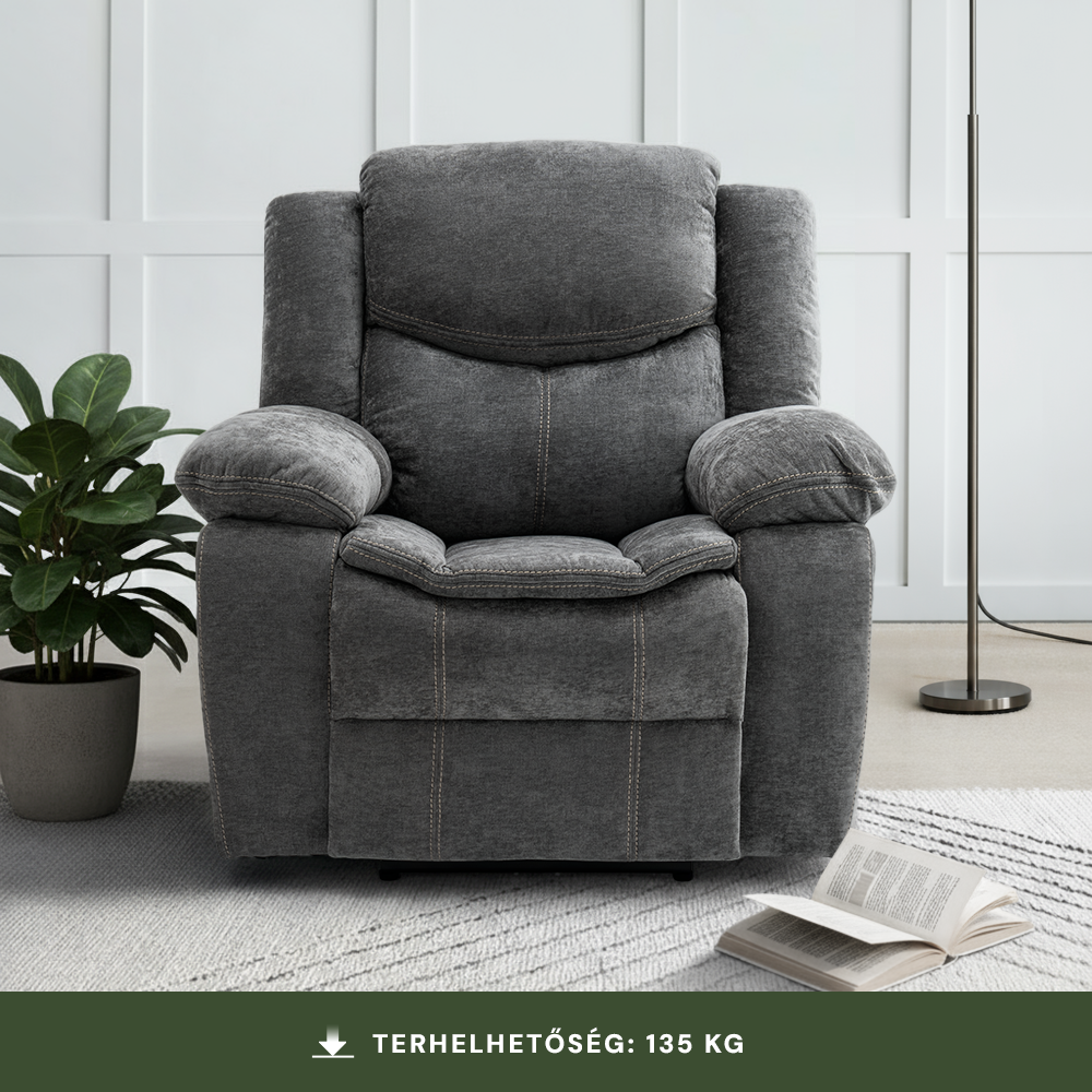 A masszív felépítésű relax fotel akár 135 kg terhelhetőséggel is rendelkezik, így hosszú távon megbízható társ lesz a pihenésben. A stabil mechanika és a minőségi anyaghasználat garantálja a biztonságos és tartós működést.