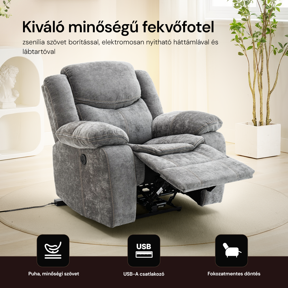 A fotel elektromosan dönthető háttámlával és kihajtható lábtartóval rendelkezik, így egyetlen gombnyomással beállítható a tökéletes pihenőpozíció. Legyen szó olvasásról, tévénézésről vagy szundításról, a fokozatmentes döntésnek köszönhetően mindig a legkényelmesebb helyzetet találhatod meg.