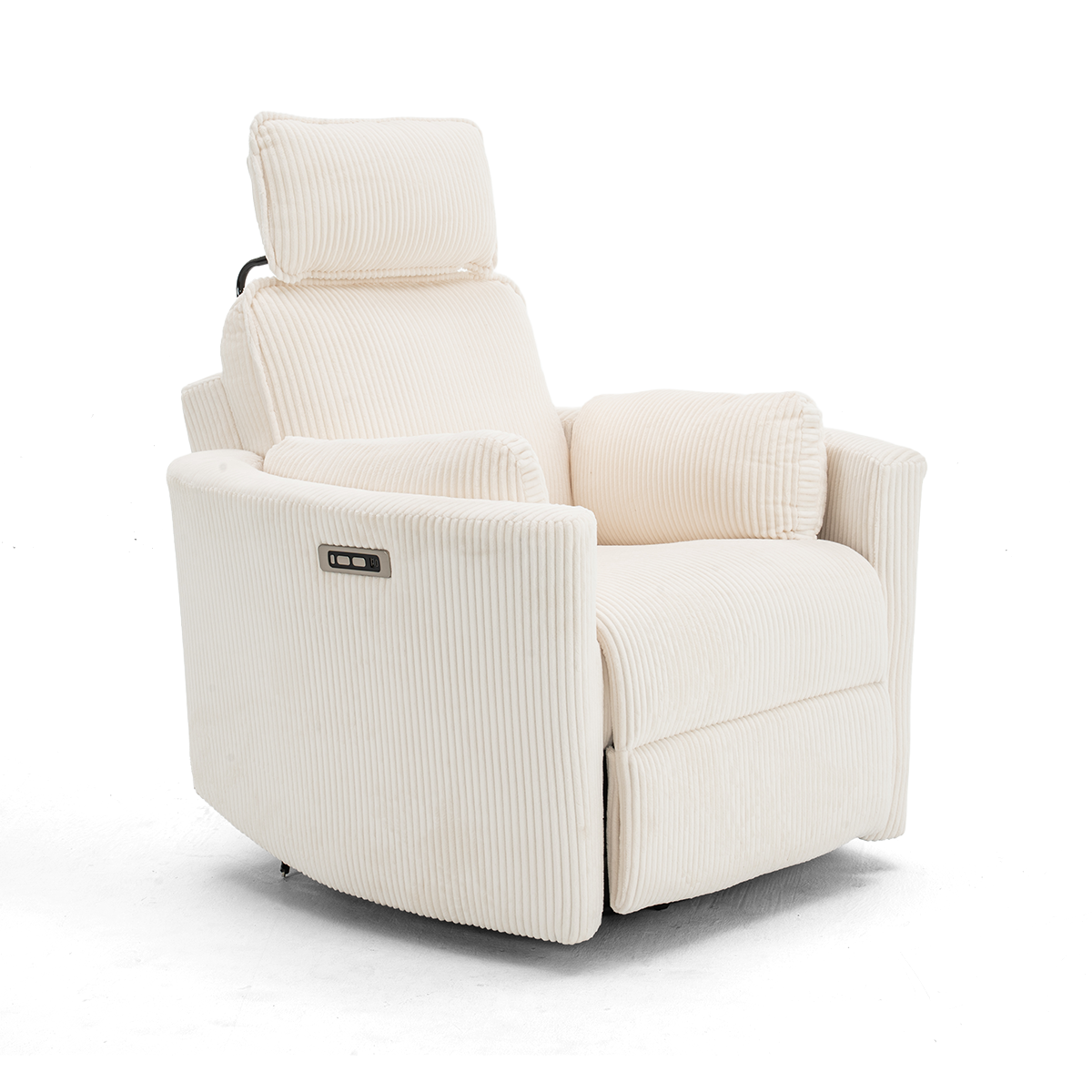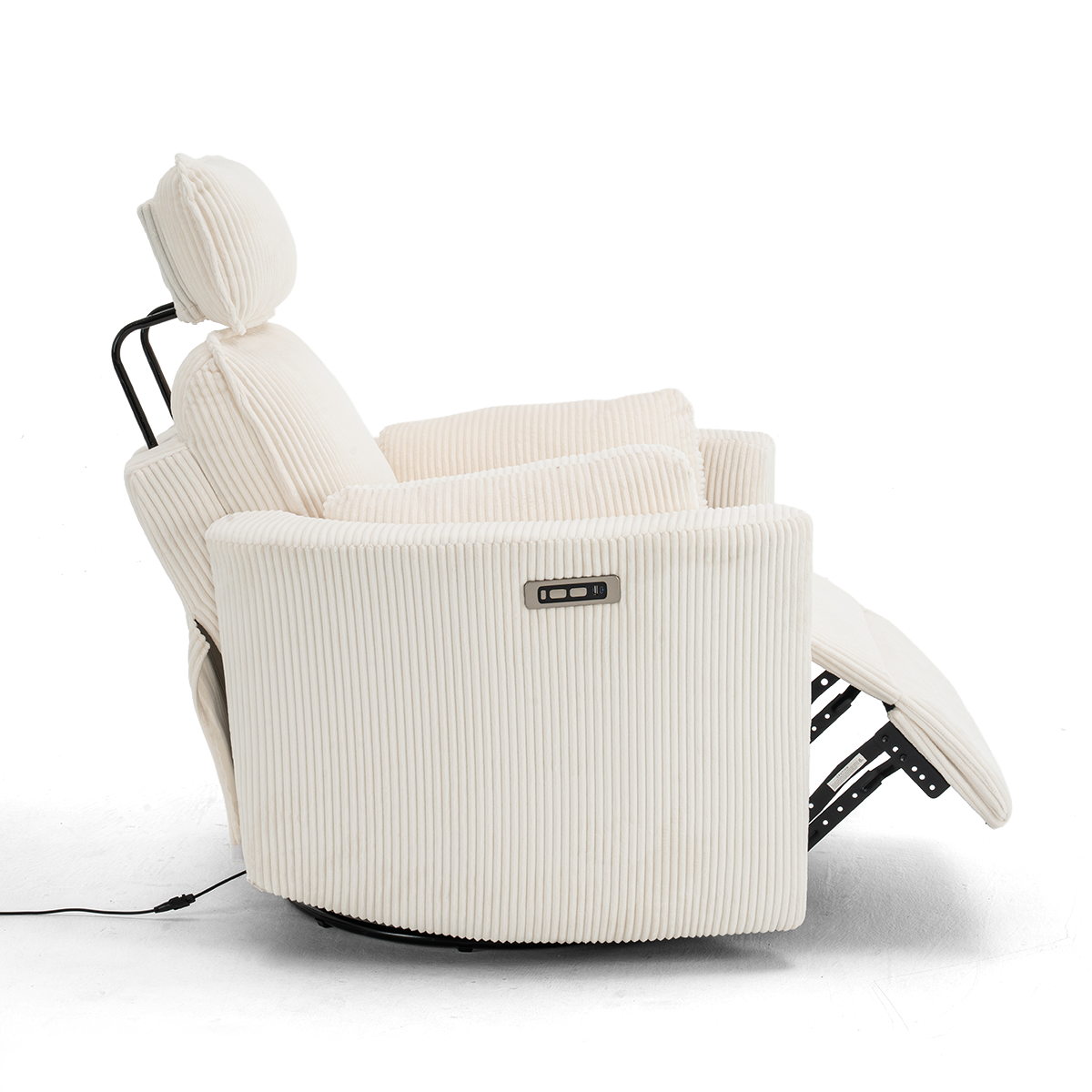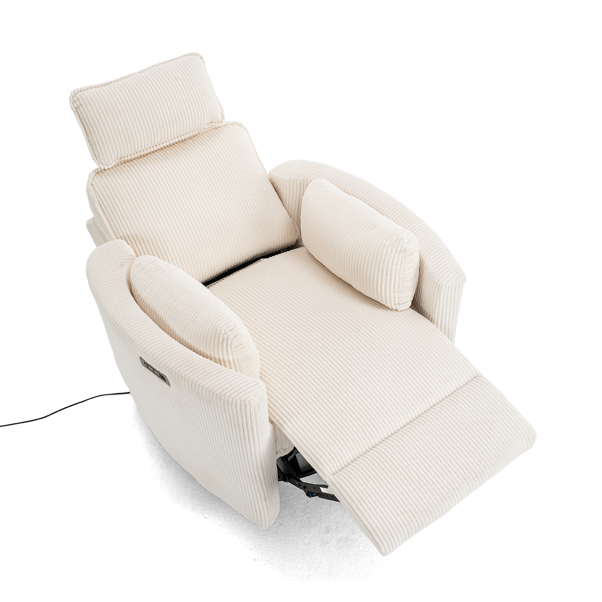 Elektromos, dönthető relax fotel, forgó és hinta funkcióval, bézs kordbársony szövet