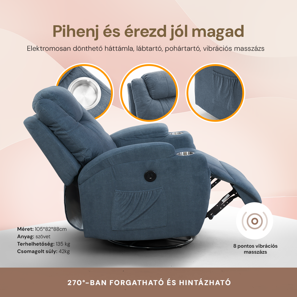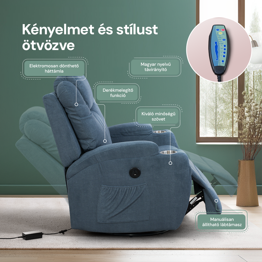 Ez a fotel nemcsak masszázst biztosít, hanem ringató és forgatható funkcióval is rendelkezik, amelyek tovább növelik a pihenés élményét. A ringató funkció nyugtató, enyhe mozgást biztosít, amely segít a relaxációban, míg a forgatható alap lehetővé teszi, hogy könnyedén elérje a környezetében lévő tárgyakat anélkül, hogy fel kellene állnia. Ezek a funkciók kombinálva teszik a fotelt a pihenés és kikapcsolódás csúcspontjává.