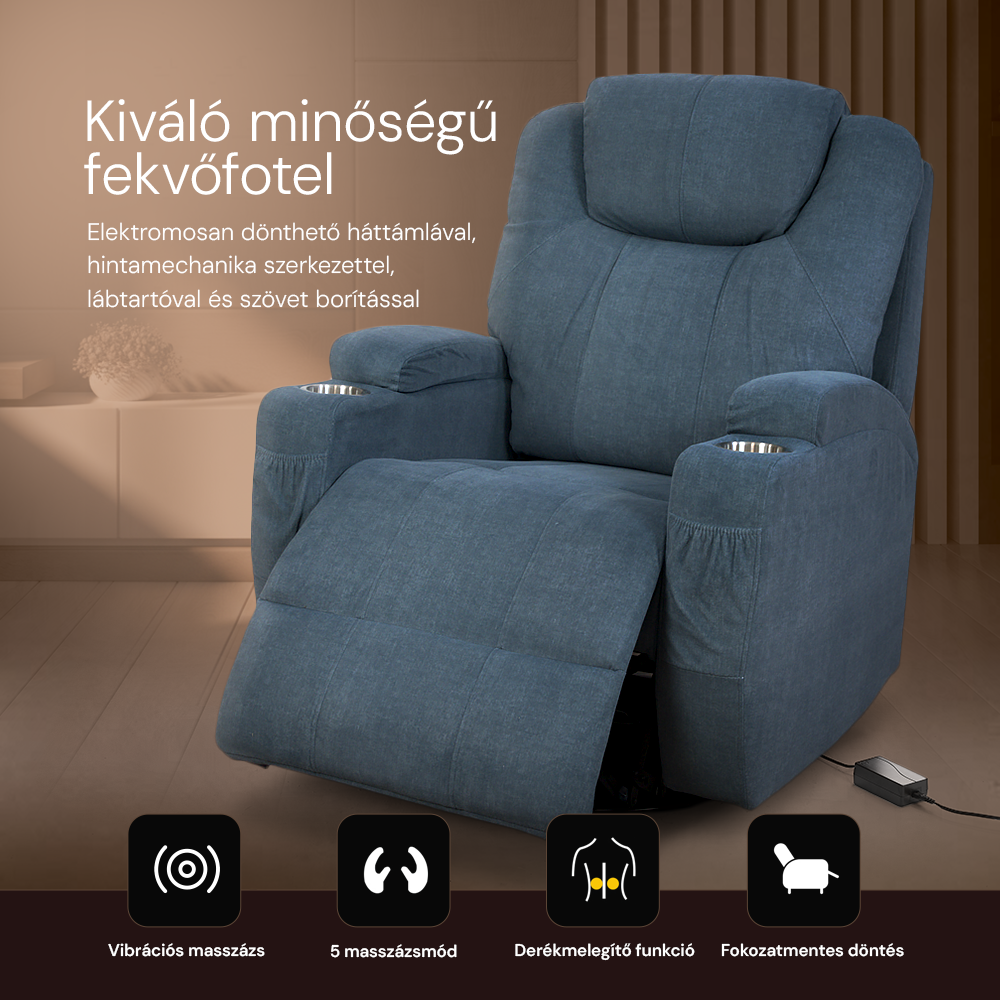 A luxus fekvőfotel tökéletes választás mindazok számára, akik maximális kényelmet és teljes relaxációt keresnek otthonukban. Ez a különleges fotel nem csupán egy hely, ahol leülhetünk, hanem egy igazi wellness élményt nyújtó eszköz, amely számos prémium funkcióval rendelkezik, hogy a pihenés élménye teljes legyen. A stílusos és tartós textil borítás, a beépített masszázsrendszer és a praktikus kiegészítők mind hozzájárulnak ahhoz, hogy ez a fotel az otthon legkedveltebb bútordarabja legyen.