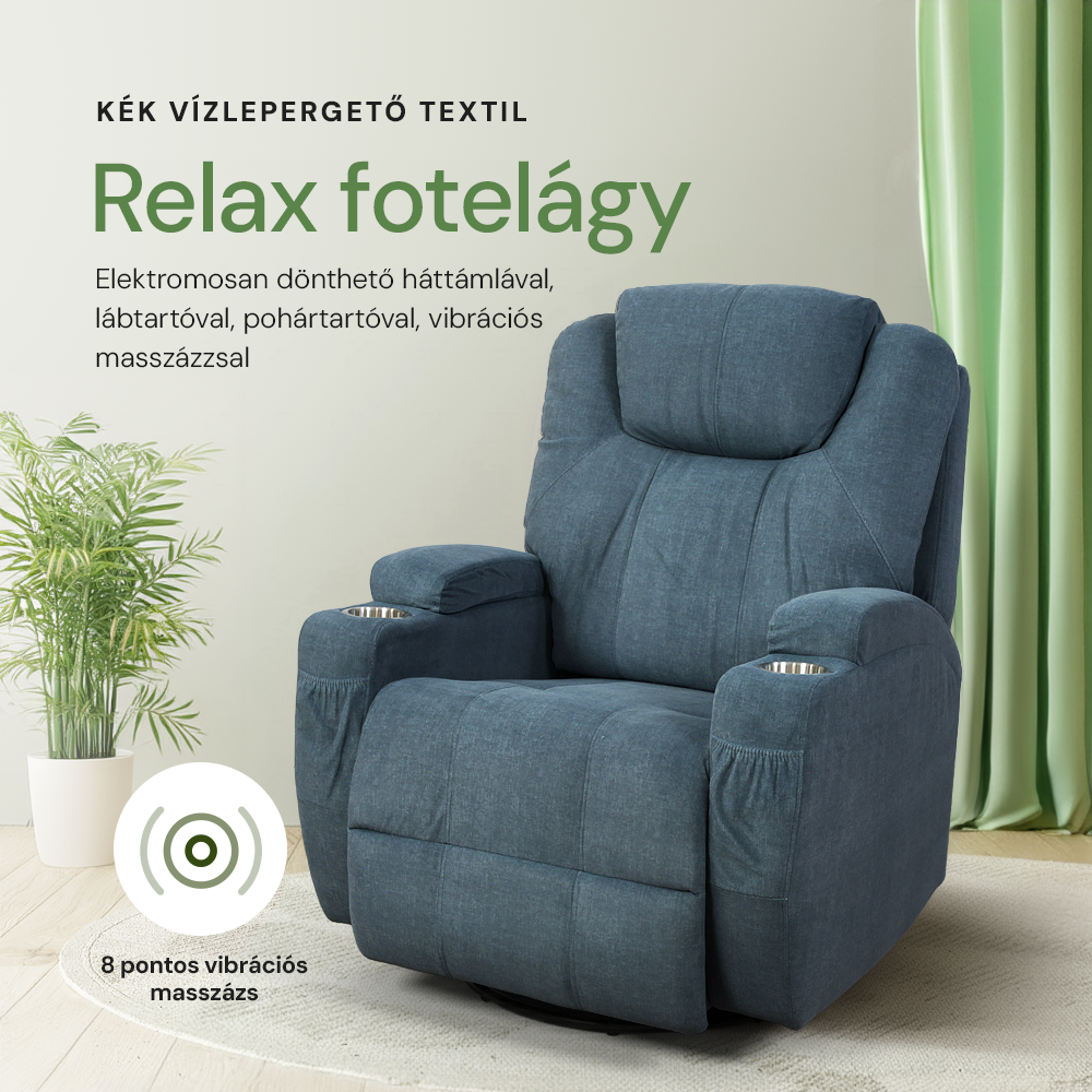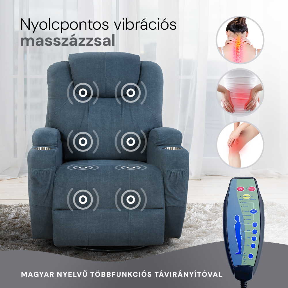 A fotel beépített 8 pontos masszázsrendszere lehetővé teszi, hogy a nap bármely szakában teljesen ellazuljon és megszabaduljon a feszültségtől. A masszázspontok elhelyezése úgy lett megtervezve, hogy a test legfontosabb területein, például a nyakon, a háton és a lábakon nyújtson enyhülést. A masszázs intenzitása és módja a mellékelt magyar nyelvű távirányítóval könnyedén állítható, így személyre szabhatja a masszázsélményt az igényeinek megfelelően.