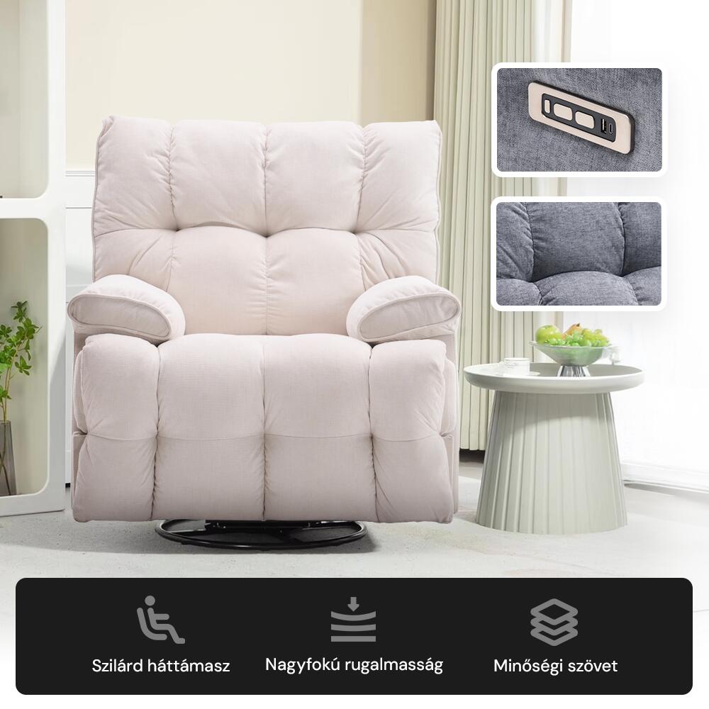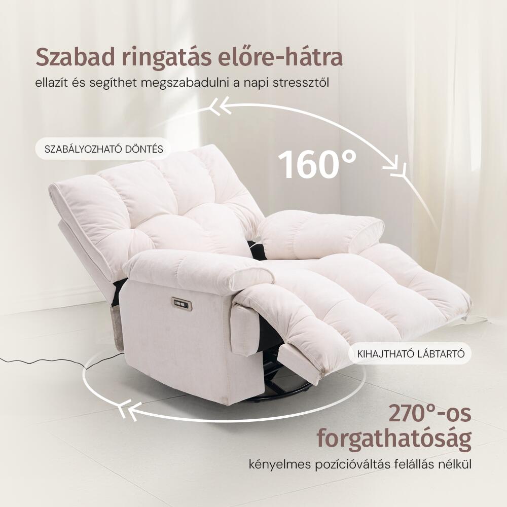 Ez a fotel nemcsak álló helyzetben nyújt kényelmet, hanem finoman hintázható is, ami tökéletes relaxációt biztosít. Emellett a fotel talpa 270°-ban forgatható, így könnyedén elérheted a körülötted lévő dolgokat anélkül, hogy fel kellene állnod a fotelből.