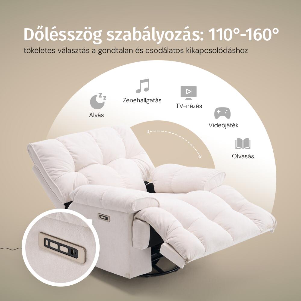 A relax fotel különlegessége, hogy beépített USB csatlakozókkal (Type-A és Type-C) rendelkezik. Így kényelmesen töltheted mobilodat, tabletedet vagy egyéb okoseszközeidet anélkül, hogy fel kellene állnod. Az elektromos vezérlés pedig nagyon egyszerű: egyetlen gombnyomással állíthatod be a tökéletes pozíciót.