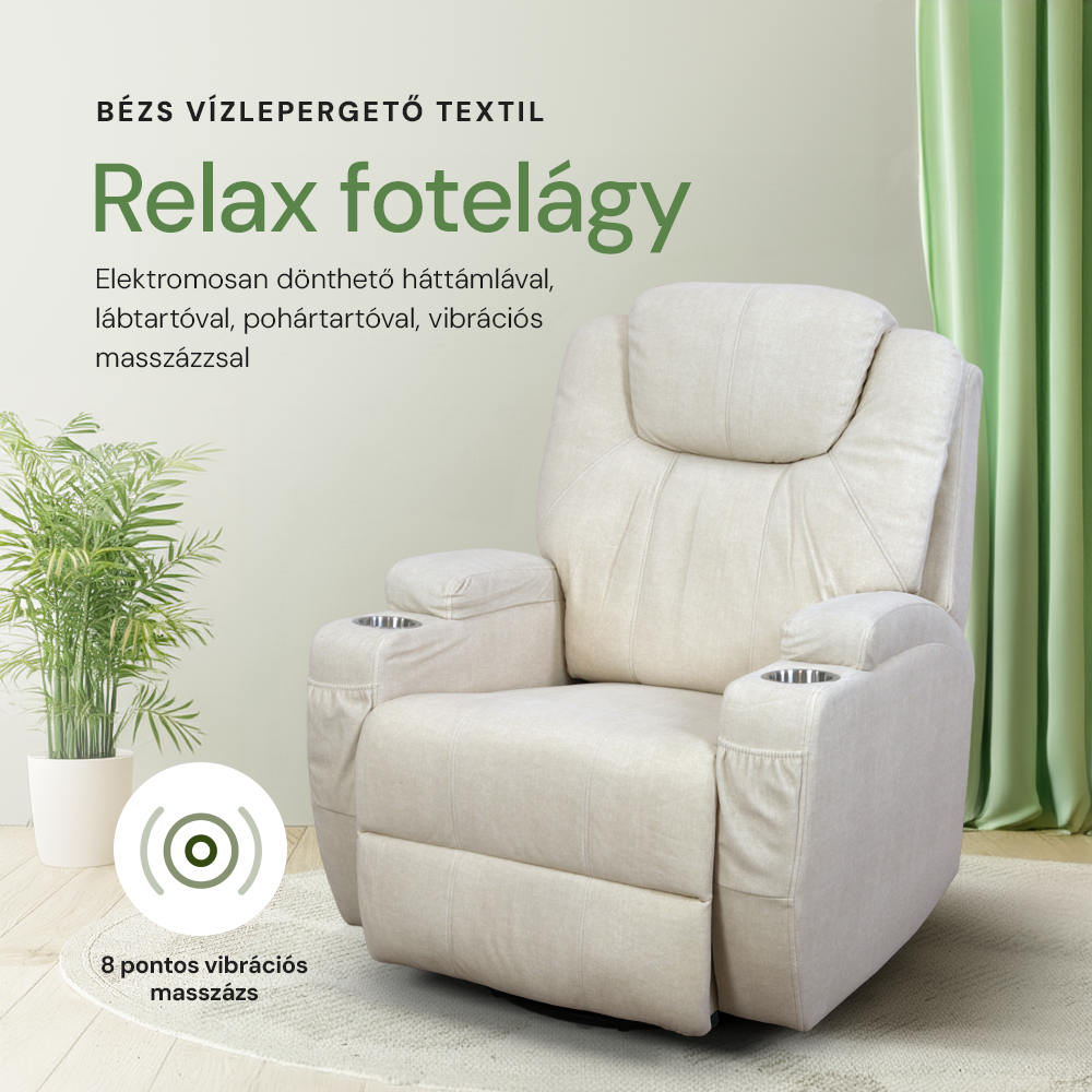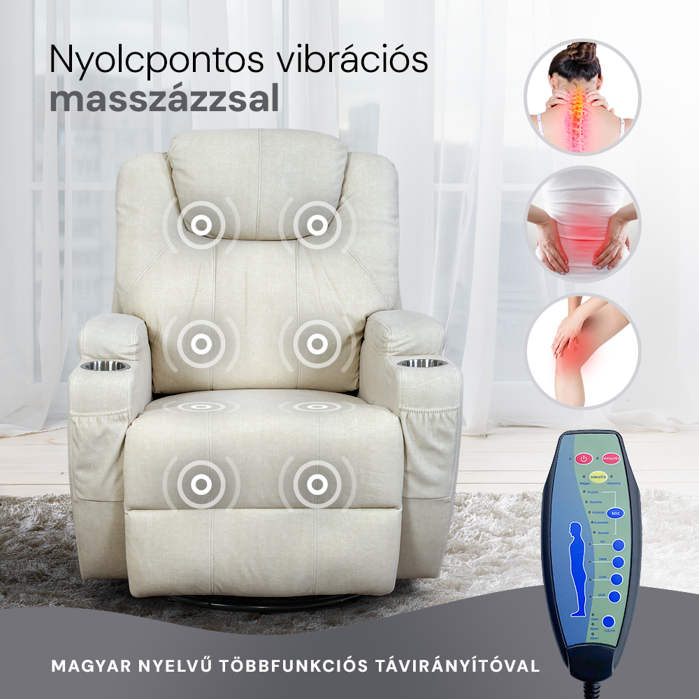A fotel beépített 8 pontos masszázsrendszere lehetővé teszi, hogy a nap bármely szakában teljesen ellazuljon és megszabaduljon a feszültségtől. A masszázspontok elhelyezése úgy lett megtervezve, hogy a test legfontosabb területein, például a nyakon, a háton és a lábakon nyújtson enyhülést. A masszázs intenzitása és módja a mellékelt magyar nyelvű távirányítóval könnyedén állítható, így személyre szabhatja a masszázsélményt az igényeinek megfelelően.