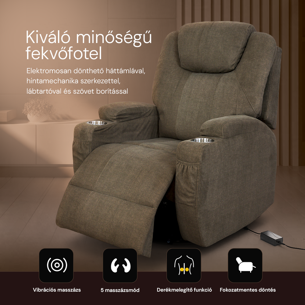 Ez a luxus fekvőfotel a kényelem és a funkcionalitás tökéletes kombinációját nyújtja, ideális választás mindazok számára, akik nem szeretnének kompromisszumot kötni a relaxáció és a stílus között. A beépített masszázsrendszer, a praktikus kiegészítők, az USB töltőport és az elegáns textil borítás mind-mind azt szolgálják, hogy otthonában egy igazi pihenőoázis legyen. Nézzen körül relax fotel kínálatunkban, fedezze fel a kínálatunkban szereplő további relaxációs fotel modelleket, és találja meg az Ön számára legmegfelelőbb darabot!