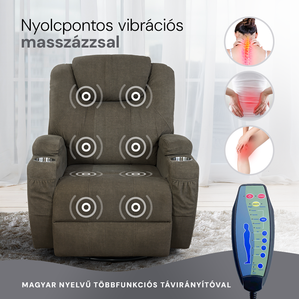 A fotel beépített 8 pontos masszázsrendszere lehetővé teszi, hogy a nap bármely szakában teljesen ellazuljon és megszabaduljon a feszültségtől. A masszázspontok elhelyezése úgy lett megtervezve, hogy a test legfontosabb területein, például a nyakon, a háton és a lábakon nyújtson enyhülést. A masszázs intenzitása és módja a mellékelt magyar nyelvű távirányítóval könnyedén állítható, így személyre szabhatja a masszázsélményt az igényeinek megfelelően.