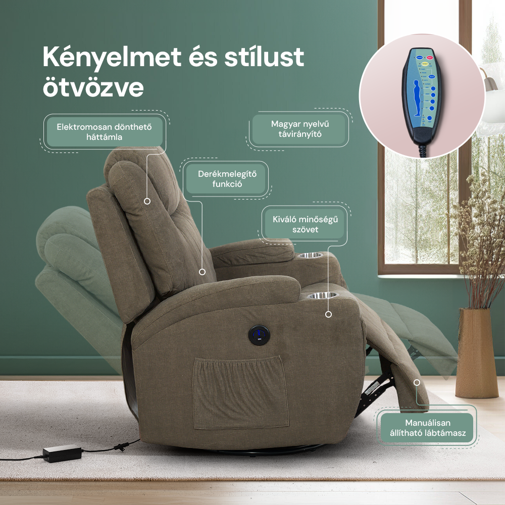 Ez a fotel nemcsak masszázst biztosít, hanem ringató és forgatható funkcióval is rendelkezik, amelyek tovább növelik a pihenés élményét. A ringató funkció nyugtató, enyhe mozgást biztosít, amely segít a relaxációban, míg a forgatható alap lehetővé teszi, hogy könnyedén elérje a környezetében lévő tárgyakat anélkül, hogy fel kellene állnia. Ezek a funkciók kombinálva teszik a fotelt a pihenés és kikapcsolódás csúcspontjává.