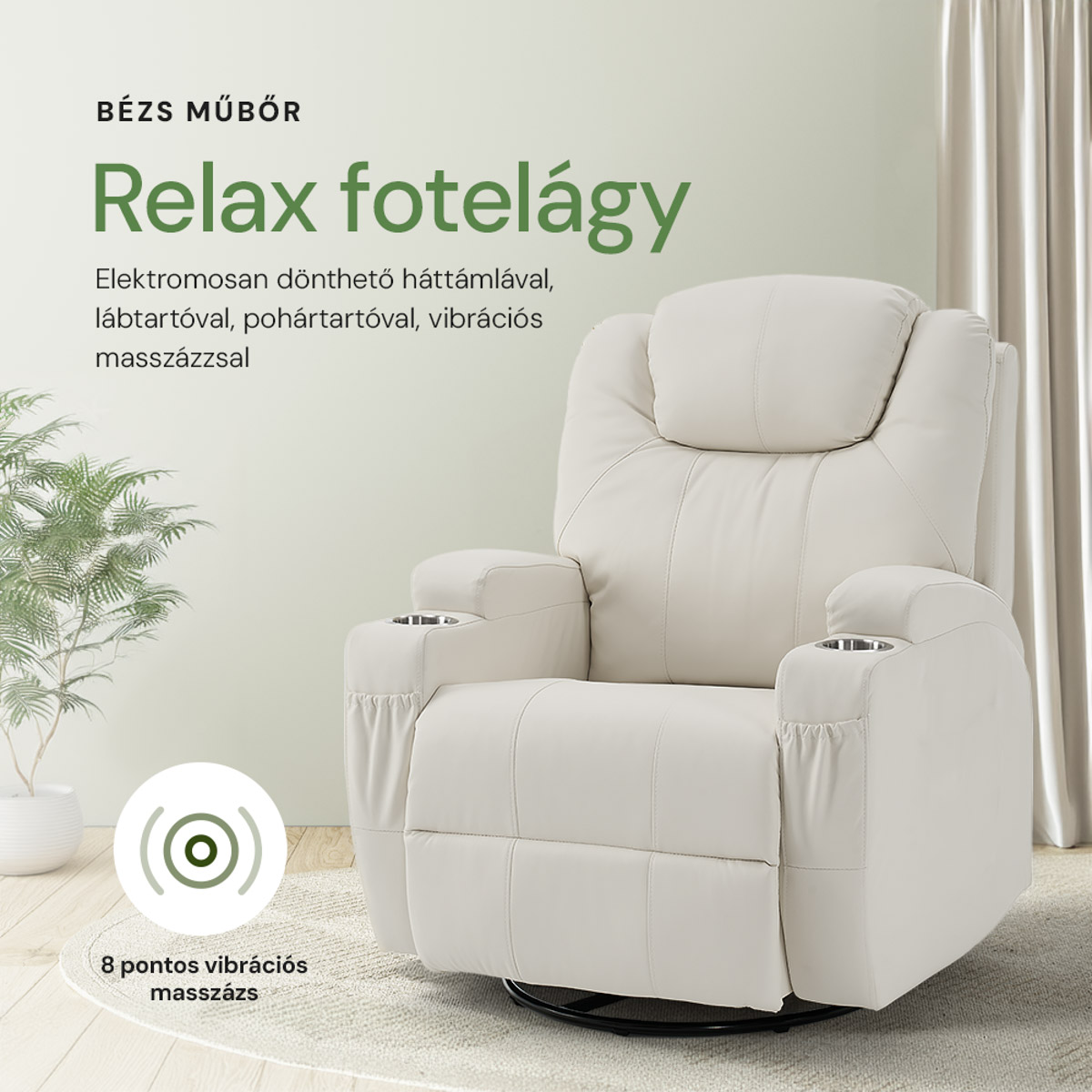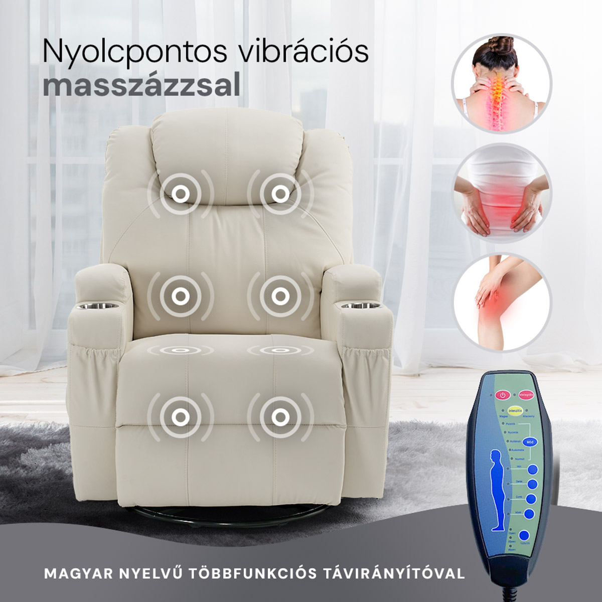 A fotel beépített 8 pontos masszázsrendszere lehetővé teszi, hogy a nap bármely szakában teljesen ellazuljon és megszabaduljon a feszültségtől. A masszázspontok elhelyezése úgy lett megtervezve, hogy a test legfontosabb területein, például a nyakon, a háton és a lábakon nyújtson enyhülést. A masszázs intenzitása és módja a mellékelt magyar nyelvű távirányítóval könnyedén állítható, így személyre szabhatja a masszázsélményt az igényeinek megfelelően.
