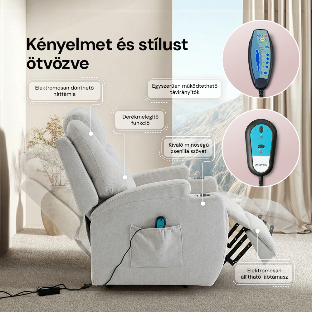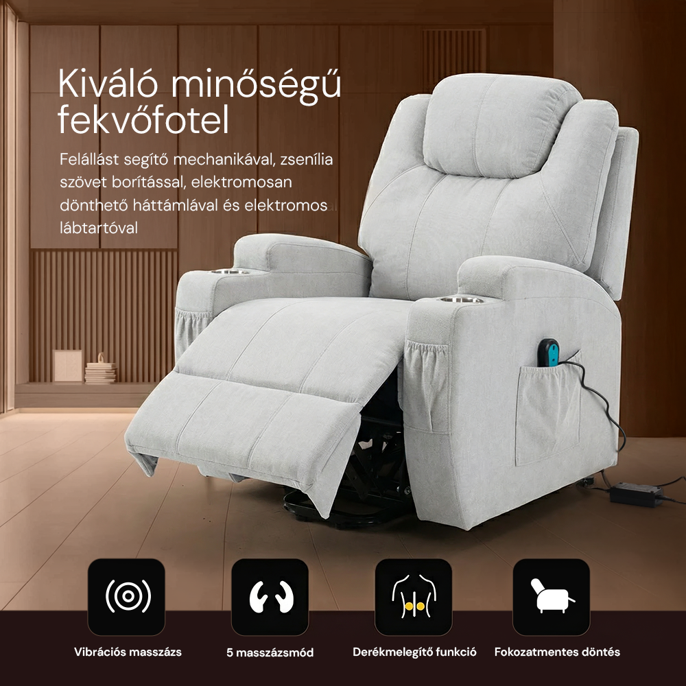 Funkciók: 8 pontos vibromasszázs, fűtés, motoros döntés és emelés