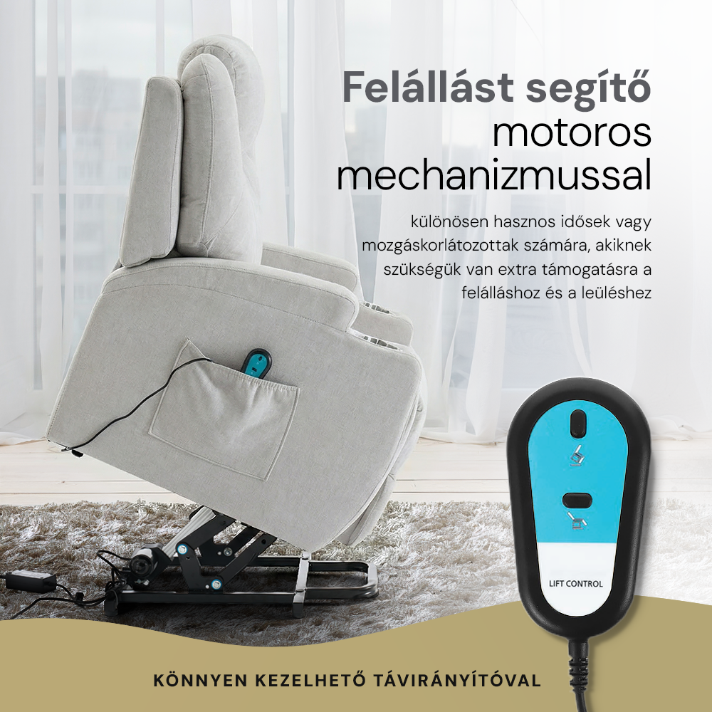 Az emelőszék motoros mechanizmusa különösen hasznos idősek vagy mozgáskorlátozottak számára, akiknek szükségük van extra támogatásra a felálláshoz és a leüléshez. A motor egyszerűen működtethető, így mindenki számára könnyedén kezelhető, legyen szó a háttámla döntéséről vagy a lábtartó beállításáról.