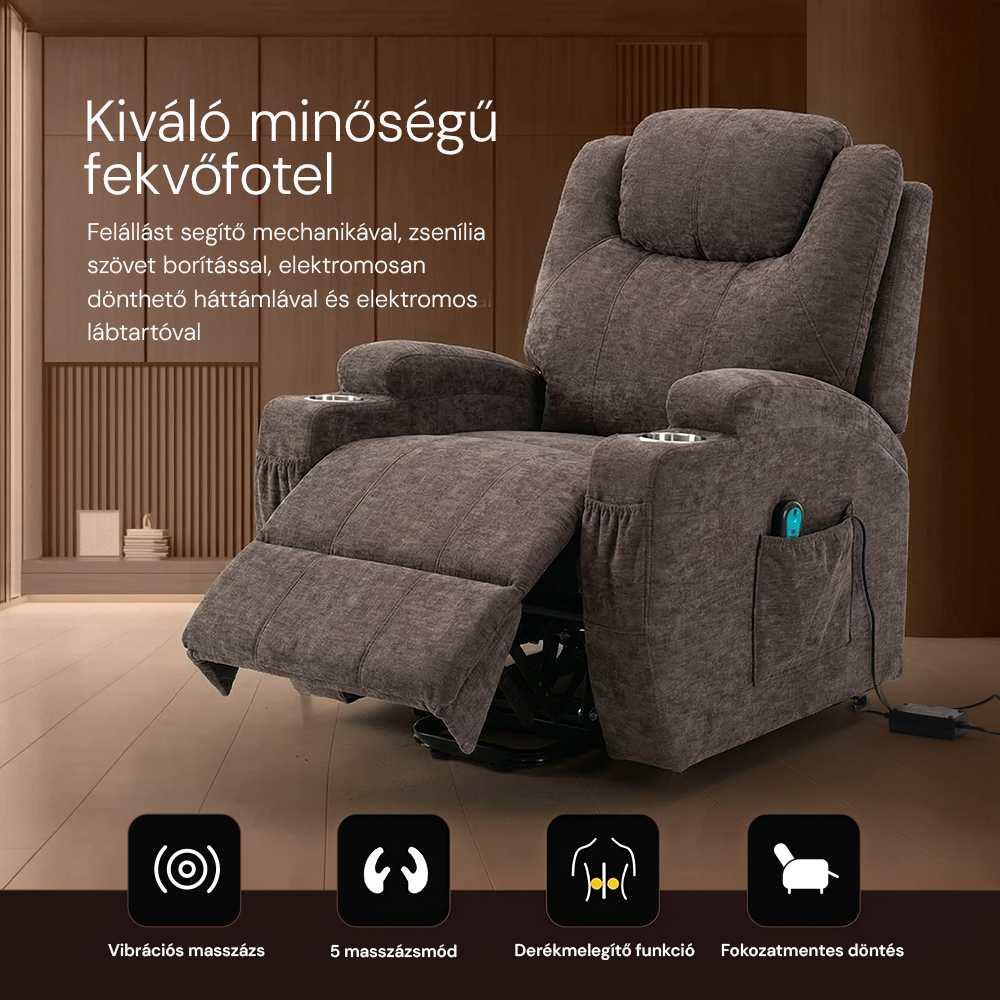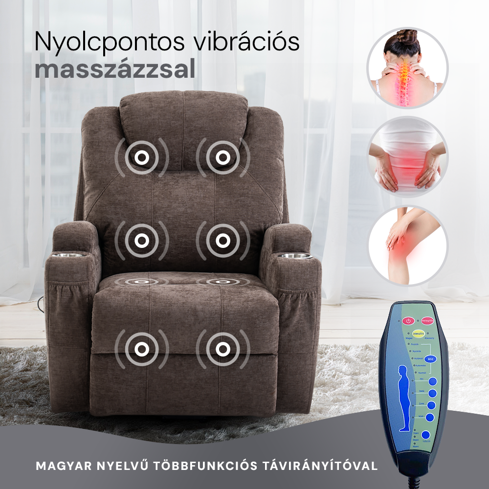 Funkciók: 8 pontos vibromasszázs, fűtés, motoros döntés és emelés