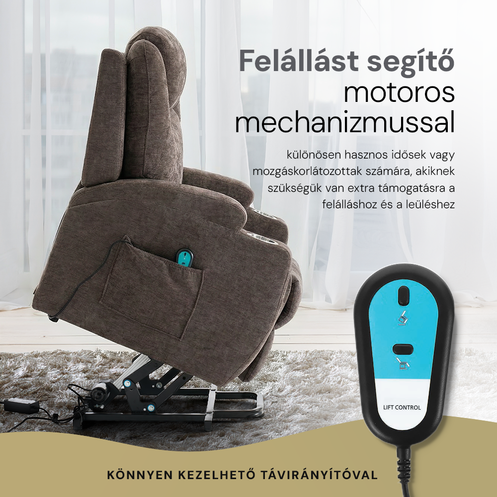 Az emelőszék motoros mechanizmusa különösen hasznos idősek vagy mozgáskorlátozottak számára, akiknek szükségük van extra támogatásra a felálláshoz és a leüléshez. A motor egyszerűen működtethető, így mindenki számára könnyedén kezelhető, legyen szó a háttámla döntéséről vagy a lábtartó beállításáról.