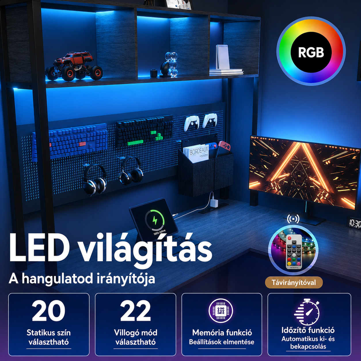 A gamer asztal RGB LED világítással rendelkezik, amelyet távirányítóval vezérelhetsz. Több mint 20 statikus szín, 22 villogó mód és demó mód közül választhatsz, emellett a fényerő is állítható. A világítás memóriával is rendelkezik, így bekapcsoláskor megőrzi az utolsó beállítást.
