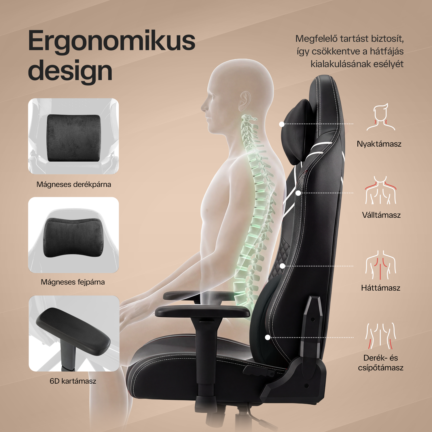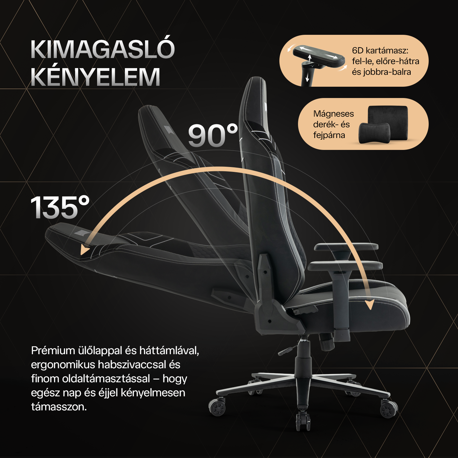 A magas, formázott háttámla megfelelően megtámasztja a hátat és a vállakat, segít fenntartani a helyes testtartást. A szék egyik legkiemelkedőbb tulajdonsága a mágneses rögzítésű fejpárna és deréktámasz, amelyek minden eddiginél egyszerűbbé teszik a személyre szabást. Nincsenek zavaró pántok: a párnák pontosan ott maradnak, ahol a leginkább szükséged van a támogatásra. A teljesen formázott szivacs kényelmes, mégis tartós ülőfelületet biztosít hosszú órákon át.